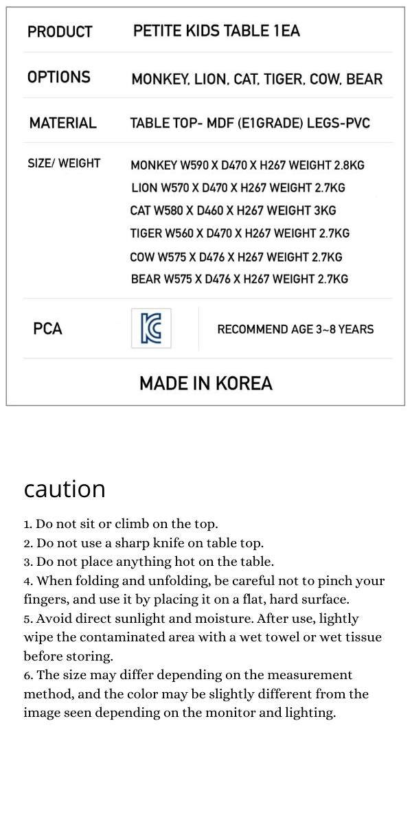 | Style | Monkey, Lion, Cat, Tiger, Cow, Bear |